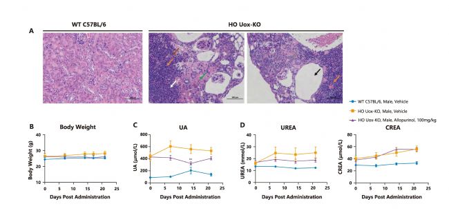 圖15. Uox-KO小鼠腎臟組織學(xué)染色分析及藥效檢測(cè)。 A. Uox-KO雄性小鼠腎臟顯示顯著的腎小管萎縮(灰色箭頭),其特征為體積縮小和嗜酸性細(xì)胞質(zhì)減少。間質(zhì)區(qū)域呈現(xiàn)明顯的結(jié)締組織增生(綠色箭頭),并伴有大量淋巴細(xì)胞(橙色箭頭)和巨噬細(xì)胞(白色箭頭)浸潤(rùn),偶見(jiàn)壞死細(xì)胞碎片(棕色箭頭);B. 小鼠體重曲線(xiàn);C. 別嘌醇對(duì)血清尿酸水平的影響。給予Uox-KO雄性小鼠別嘌醇(100mg/kg)處理后,小鼠的血清尿酸水平顯著降低;D. 腎功能評(píng)估。Uox-KO雄性小鼠的腎功能與C57BL/6小鼠相比無(wú)顯著差異。