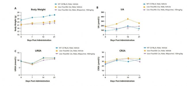 圖16. Uox-Flox/Alb-Cre小鼠藥效檢測(cè)。A. 小鼠體重曲線(xiàn);B. 別嘌醇對(duì)小鼠血清尿酸水平的影響。給予Uox-Flox/Alb-Cre雄性小鼠進(jìn)行別嘌醇(100mg/kg)處理后,小鼠的血清尿酸水平顯著降低;C. 腎功能評(píng)估。Uox-Flox/Alb-Cre雄性小鼠的腎功能與C57BL/6小鼠相比無(wú)顯著差異。