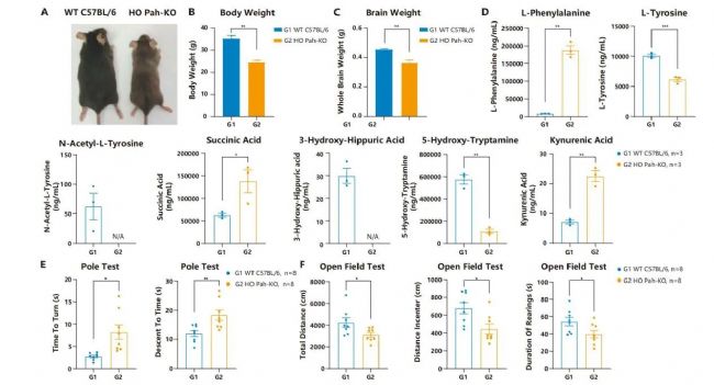 圖17. Pah-KO小鼠的基礎(chǔ)表型檢測(cè)。A. 小鼠外形特征。Pah-KO小鼠毛發(fā)顏色更淺;B. 小鼠體重分析;C. 小鼠腦重分析顯示。Pah-KO小鼠的腦重量顯著降低;D. Pah-KO小鼠血生化檢測(cè); E. 爬桿實(shí)驗(yàn)檢測(cè)小鼠運(yùn)動(dòng)能力。Pah-KO組小鼠在爬桿上轉(zhuǎn)身以及從桿上爬下所需的時(shí)間均顯著延長(zhǎng),表明Pah-KO組小鼠表現(xiàn)出運(yùn)動(dòng)能力受損;F. 曠場(chǎng)實(shí)驗(yàn)檢測(cè)小鼠運(yùn)動(dòng)能力及焦慮水平。Pah-KO組小鼠總運(yùn)動(dòng)距離、在中心運(yùn)動(dòng)距離顯著降低,站立時(shí)長(zhǎng)更短,表現(xiàn)出更低的運(yùn)動(dòng)水平與更高的焦慮水平。
