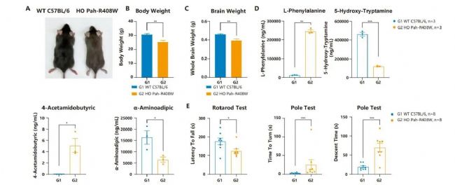圖18. Pah-R408W突變小鼠的基礎(chǔ)表型檢測(cè)。 A. 小鼠外形特征。Pah-R408W小鼠毛發(fā)顏色更淺;B. 小鼠體重分析;C. 小鼠腦重分析顯示。Pah-R408W小鼠的腦重量顯著降低;D. Pah-R408W檢測(cè)小鼠血生化;E. 轉(zhuǎn)棒實(shí)驗(yàn)與爬桿實(shí)驗(yàn)檢測(cè)小鼠運(yùn)動(dòng)能力。Pah-R408W組小鼠從轉(zhuǎn)棒上跌落的潛伏期更短,在爬桿上轉(zhuǎn)身以及從桿上爬下所需的時(shí)間均顯著延長(zhǎng),表明Pah-R408W組小鼠表現(xiàn)出運(yùn)動(dòng)能力受損。