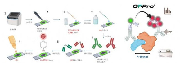 面對CyTOF初篩出的核心細胞群體,HAWK核心技術(shù)QF-Pro的整體實驗流程與傳統(tǒng)免疫熒光染色十分接近(圖3)。但較于免疫熒光染色較差的分辨率(200nm以上),QF-Pro利用熒光能量共振轉(zhuǎn)移(FRET)聯(lián)合時間分辨熒光(FLIM),在蛋白相互作用功能分析的分辨率是10nm。即兩種特定熒光基團靠得足夠近(10nm以內(nèi))時出現(xiàn)FRET現(xiàn)象,導(dǎo)致熒光壽命縮短,熒光壽命的變化被FLIM收集,從而精確驗證目的標志物是否存在真實的相互作用 。因此,HAWK的高分辨率,有效避免了常規(guī)多重?zé)晒饧捌渌夹g(shù)單純的空間重疊但無相互作用的假陽性信號問題;同時,熒光壽命縮短是熒光分子的內(nèi)在屬性,不受濃度、酸堿度等外界條件影響,HAWK的精準定量分析更穩(wěn)定、更準確。