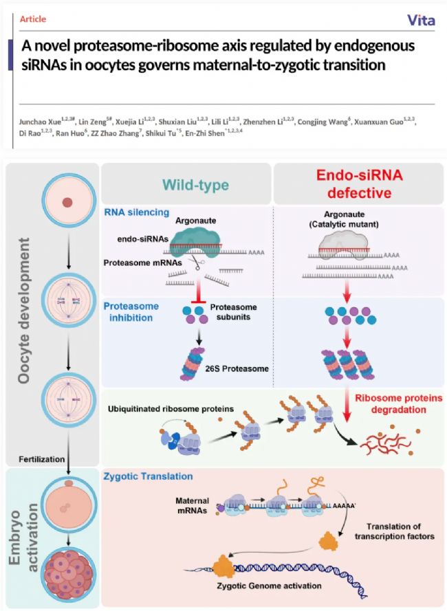 值得一提的是,在同一天,西湖大學(xué)與上海交通大學(xué)強(qiáng)強(qiáng)聯(lián)合,在《Vita》期刊上發(fā)表了另一篇題為“A novel proteasome-ribosome axis regulated by endogenous siRNAs in oocytes governs maternal-to-zygotic transition”的研究論文。