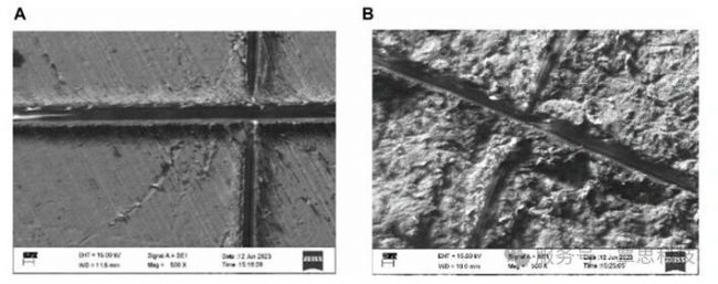 在鍍層附著力測(cè)試中,對(duì)PEEK樣品表面做劃痕并剝離膠帶后觀察損傷情況:(A)未噴砂處理的樣品與(B)噴砂處理過(guò)的樣品。SEM圖像表明,無(wú)論是否噴砂處理,鉑涂層在劃痕周圍均未出現(xiàn)明顯剝離或脫落現(xiàn)象,表明鍍層附著性能良好。