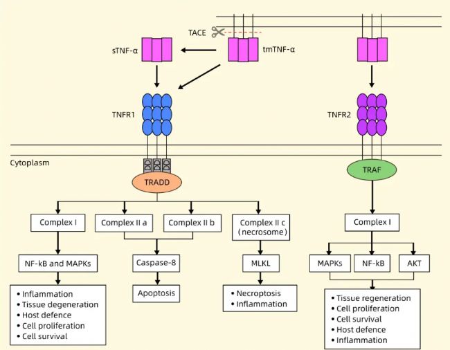 在分子機(jī)制上,TNF-α通過結(jié)合兩種不同的細(xì)胞表面受體TNFR1和TNFR2來傳導(dǎo)信號(hào)?扇苄耘c膜結(jié)合型TNF-α與TNFR1結(jié)合后,主要通過招募TRADD、TRAF2等銜接蛋白,激活三條下游通路:NF-κB通路、MAPK通路(如JNK、p38)以及 caspase介導(dǎo)的凋亡通路。而膜結(jié)合型TNF-α與TNFR2結(jié)合,則傾向于激活PI3K/Akt等促進(jìn)細(xì)胞存活與增殖的信號(hào),并能調(diào)節(jié)血管生成(如通過VEGF途徑),同時(shí)對(duì)TNFR1介導(dǎo)的NF-κB信號(hào)起到一定的調(diào)控作用。