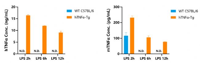 圖2. 通過ELISA檢測(cè)血漿中人TNFa和鼠TNFa蛋白的表達(dá)。