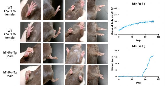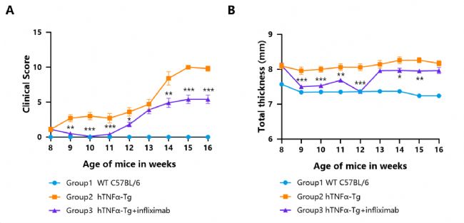 圖4.英夫利昔單抗在hTNFα-Tg類風(fēng)濕關(guān)節(jié)炎小鼠模型中的體內(nèi)藥效研究。該研究自小鼠8周齡起,每周通過腹腔注射給予英夫利昔單抗。(A)hTNFα-Tg類風(fēng)濕關(guān)節(jié)炎小鼠模型的臨床評(píng)分和(B)足爪厚度(n=6)。