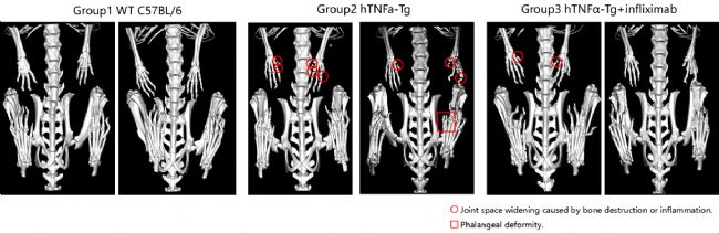 圖5.英夫利昔單抗在hTNFα-Tg類風(fēng)濕關(guān)節(jié)炎小鼠模型中的體內(nèi)藥效研究。hTNFα-Tg類風(fēng)濕關(guān)節(jié)炎小鼠模型各組踝關(guān)節(jié)的代表性三維圖像。