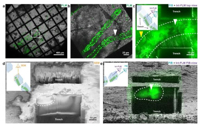 植物樣品經(jīng)高壓冷凍后,目標(biāo)細(xì)胞被包裹在厚達(dá)數(shù)十微米的透明冰中,在電子束下無法直接識(shí)別。傳統(tǒng)的離子束銑削缺乏定位能力,難以精確切割出包含特定細(xì)胞器或連接處的超薄冰片。