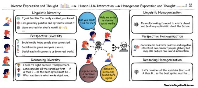 近日,南加州大學(xué)的研究團(tuán)隊(duì)在Cell子刊《Trends in Cognitive Sciences》上發(fā)表了一篇頗具影響力的觀點(diǎn)文章,題為《The homogenizing effect of large language models on human expression and thought》(大語言模型對(duì)人類表達(dá)和思維的同質(zhì)化影響)。