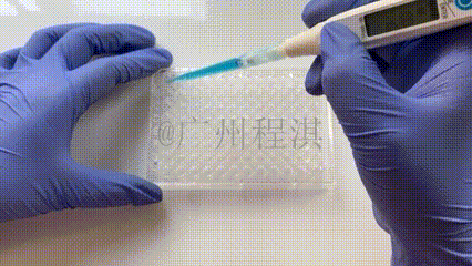 7、用Pipetty連續(xù)分液模式吸取50μL 1%雞紅細(xì)胞懸液,加入反應(yīng)板每孔中,輕輕振蕩混勻,置于22℃±2℃環(huán)境中孵育30min;