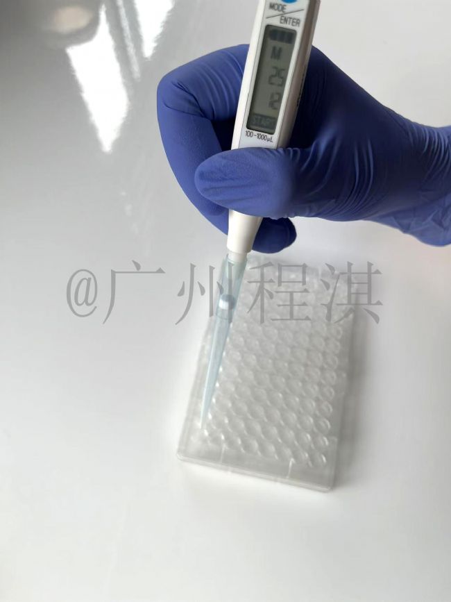 4、使用Pipetty電動移液器,設(shè)置連續(xù)分液模式,吸取25μL PBS緩沖液,加入96孔微量反應(yīng)板各孔中。