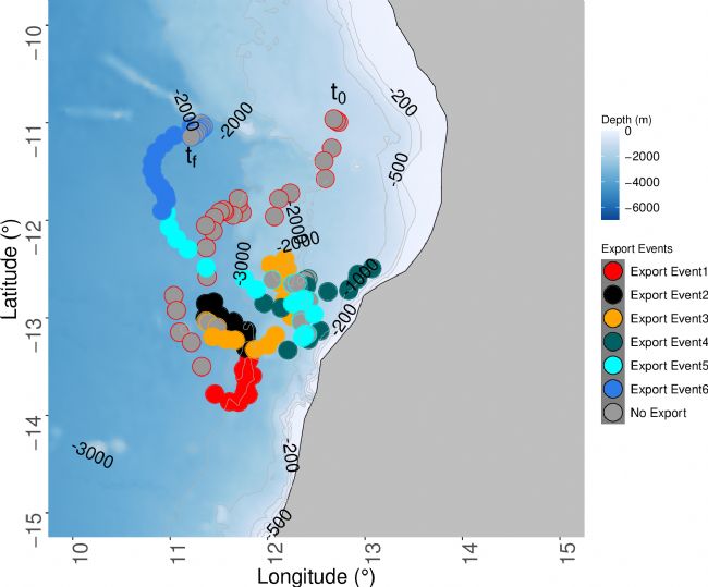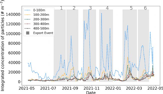 UVP6數(shù)據(jù)顯示研究期間識別出7次表層海洋雪輸出事件(圖3,圖4),其中6次形成向深層的輸出羽流。前五次事件以球狀物和絲狀物為主,這與上升流驅(qū)動的浮游植物水華相關(guān);最后一次事件以聚集體為主,可能與剛果河海岸輸入有關(guān)。