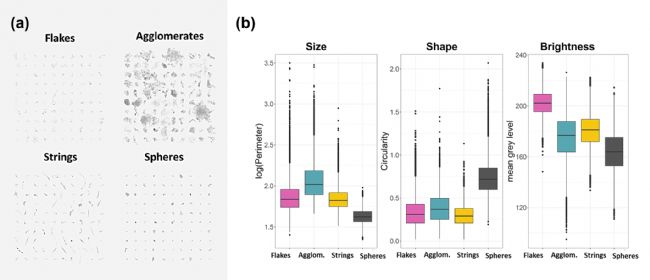 圖5(a)四種形態(tài)海洋雪類型示例(絮狀物、聚集體、絲狀物、球狀物);(b)各形態(tài)的平均形態(tài)特征(周長、圓度、灰度)