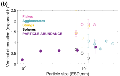 球狀物衰減最弱(b=0.27±0.23),聚集體居中(b=0.88±0.3),絮狀物和絲狀物衰減最強(b≈1.8)。隨深度增加,絮狀物和絲狀物比例下降,球狀物比例上升,表明密實顆粒更易輸送到深層。衰減主要發(fā)生在表層200 m內(nèi),與微生物降解和浮游動物攝食有關(guān)。