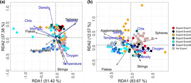 典型冗余分析顯示,溫度、溶解氧、密度等環(huán)境變量與顆粒形態(tài)組成顯著相關(guān)(圖8),上升流驅(qū)動的營養(yǎng)鹽輸入和物理水團結(jié)構(gòu)共同調(diào)控顆粒物生產(chǎn)與輸出過程。