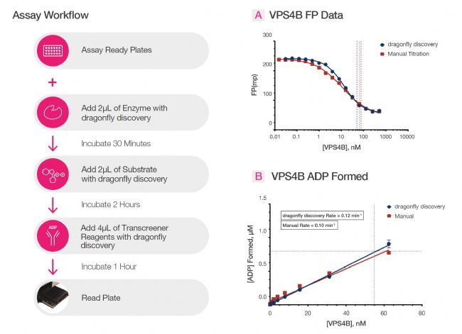 VPS4B(液泡蛋白分選相關(guān)蛋白4B)是減數(shù)分裂亞群AAA ATP酶家族(meiotic clade AA ATPase)成員,該類酶以寡聚體形式發(fā)揮功能,通過ATP水解驅(qū)動蛋白轉(zhuǎn)運。VPS4B在某些癌癥中過表達,且與其同源蛋白VPS4A存在合成致死關(guān)系,使VPS4B成為具有潛力的治療靶點。本研究開發(fā)了一種基于VPS4B抑制劑的篩選與分析技術(shù)平臺。該平臺的核心是結(jié)合Transcreener® ADP2 Assay與SPT Labtech dragonfly® discovery非接觸式加樣技術(shù)進行ATP酶活性測定,旨在通過流程優(yōu)化,最大限度減少實驗的不穩(wěn)定,確保篩選結(jié)果的可靠且準(zhǔn)確。