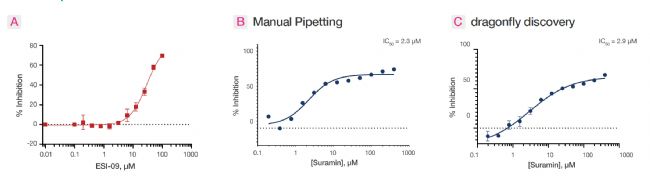 A. 從初篩中獲得的陽性化合物ESI-09及對照化合物Suramin的劑量反應(yīng)曲線,實驗在384孔板中進行。其中,對照化合物Suramin的IC50值在手動移液和 dragonfly® discovery 平臺上分別是B. 2.3 μM和C. 2.9 μM。