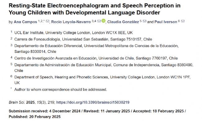 Campos, A., Loyola-Navarro, R., González, C., & Iverson, P. (2025). Resting-State Electroencephalogram and Speech Perception in Young Children with Developmental Language Disorder. Brain Sciences, 15(3), 219.
