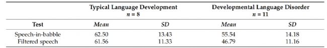 研究者評估了兒童噪聲言語感知和濾波言語感知技能。兒童在噪聲言語測試中數(shù)據(jù)呈正態(tài)分布,但在過濾語音測試中數(shù)據(jù)未呈正態(tài)分布。在噪聲言語測試中,獨立樣本t檢驗顯示組間差異不顯著。在濾波言語測試中,典型語言發(fā)展組的正確分數(shù)中位數(shù)顯著高于障礙組。