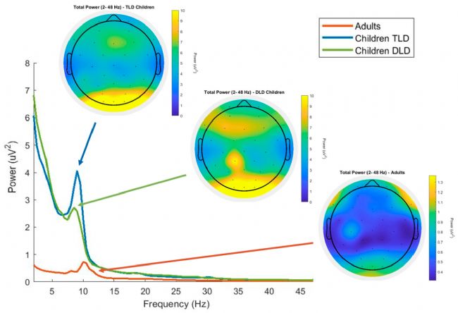研究者計算了每組參與者的平均功率譜(圖1)。所有三個組在α波段都顯示出峰值,隨后能量減少。在兒童組中,α峰值出現(xiàn)在略低于10 Hz的位置,而在成年人中則觀察到10 Hz,典型語言發(fā)展組α峰值比發(fā)展性語言障礙組大。