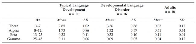 本研究涉及組內和組間分析,自變量為語言狀況,包括典型語言發(fā)展、發(fā)展性語言障礙和成人。因變量包括(1)在θ波、α波、β波和γ波頻帶的平均帶寬功率;(2)振蕩偏側化;(3)聽覺噪聲中語音和濾波語音測試的正確反應百分比。