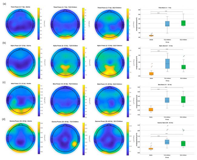 內源性振蕩反映了參與認知過程的大腦網(wǎng)絡的自發(fā)活動。成人中不同頻帶的內源性活動與語言及語音感知處理相關,但典型和非典型發(fā)育兒童中此活動的發(fā)展情況尚不清晰。因此,一篇發(fā)表在Brain Sciences期刊上名為《Resting-State Electroencephalogram and Speech Perception in Young Children with Developmental Language Disorder》的文章探究了患有發(fā)展性語言障礙(DLD)的學齡前兒童、正常語言發(fā)展兒童(典型語言發(fā)展,TLD),以及成人在靜息態(tài)腦電圖中的差異。研究觀察到成人的振蕩功率顯著低于兒童,但在兒童組間功率或大腦半球側化方面沒有差異,表明振蕩活動反映了年齡差異,而非語言發(fā)展,此文章為兒童內源性振蕩的研究提供了理論支撐。