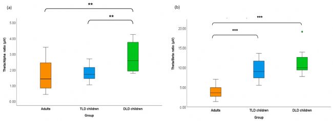 一個偶然發(fā)現(xiàn)是頻帶功率比率明顯的不同(圖3)。發(fā)展性語言障礙兒童的θ/α功率比顯著高于成人和典型語言發(fā)展兒童。成人的θ/β功率比顯著小于兩組兒童的比率,但在兒童組間沒有差異。