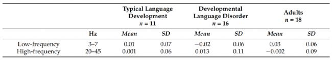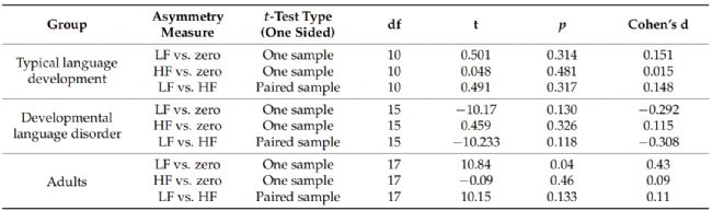表4展示了組內分析的結果,所有組中均沒有顯著的不對稱性。研究者同樣比較了典型語言發(fā)展組、發(fā)展性語言障礙組和成人組之間低頻和高頻振蕩的側化指數(shù),顯示在低頻和高頻之間沒有組間差異。