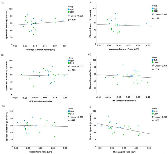 研究者考察了兒童在語音知覺測試中的表現(xiàn)與靜息態(tài)測量指標之間是否存在關聯(lián)。噪聲言語測試中正確答案百分比與平均γ波段功率沒有顯著相關性(圖5a);濾波言語測試中正確答案百分比與平均γ功率也沒有顯著相關性(圖5b);噪聲言語測試與高頻振蕩側化指數(shù)沒有顯著相關性(圖5c);濾波言語測試正確答案百分比與高頻振蕩側化指數(shù)也沒有顯著相關性(圖5d);噪聲言語測試(圖5e)與θ/α功率比值沒有相關性;盡管濾波言語測試分數(shù)和θ/α比率存在中等的負相關性,但經(jīng)過α校正后并不顯著(圖5f)。