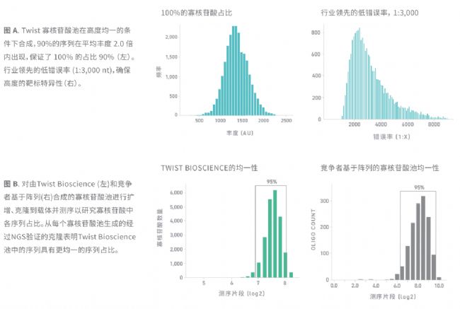 Oligo pool是Twist利用硅基 DNA 編寫技術(shù)合成的高度多樣化的單鏈寡核苷酸集合。Twist合成平臺能夠在每次運(yùn)行中大規(guī)模并行生產(chǎn)成千上萬個高質(zhì)量、高精度的寡核苷酸,從而生成復(fù)雜多樣的寡核苷酸池,用于CRISPR篩選等應(yīng)用。