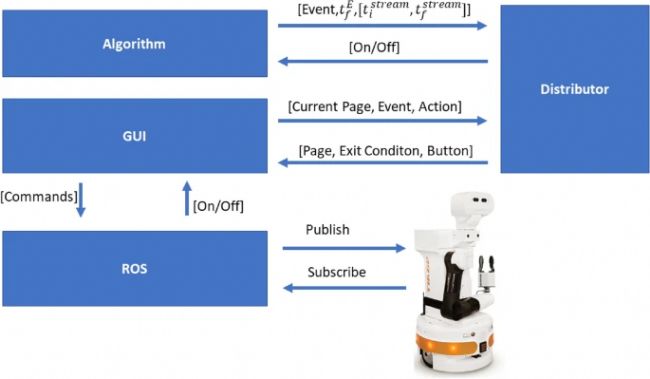 選用PAL ROBOTICS的TIAGo機(jī)器人,基于ROS Melodic框架在Ubuntu 18.04系統(tǒng)搭建BCI控制系統(tǒng),含眼偽影檢測算法、眨眼頻次分配器、圖形用戶界面(GUI)、ROS通信分配器四大子系統(tǒng);