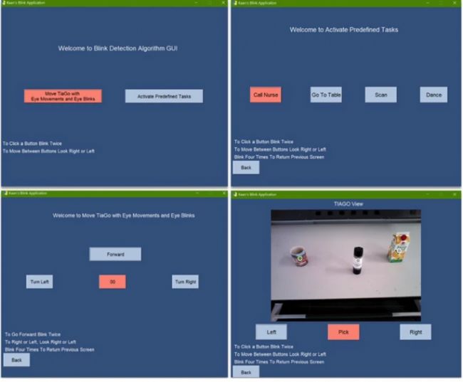 通過GUI設(shè)計機(jī)器人基座移動、預(yù)設(shè)任務(wù)選擇等功能,定義側(cè)向眼動切換按鈕、雙眨眼確認(rèn)操作、四次眨眼返回上一頁的眼偽影控制邏輯。
