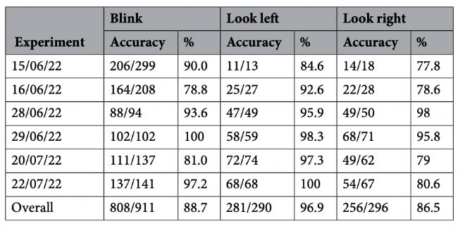 對6組不同日期的單受試者數(shù)據(jù)進(jìn)行檢測,整體準(zhǔn)確率表現(xiàn)為:眨眼88.7%(808/911)、左看96.9%(281/290)、右看86.5%(256/296),單組實(shí)驗(yàn)中各動作最低準(zhǔn)確率分別為眨眼78.8%、左看84.6%、右看77.8%;煜仃囷@示,誤分類多因多個眼動事件連續(xù)發(fā)生導(dǎo)致,少量右看和眨眼事件被誤判為左看,無左看事件被誤判為眨眼的情況。