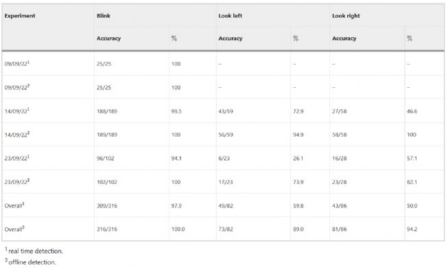 實(shí)時實(shí)驗(yàn)中受試者完成316次眨眼、82次左看、83次右看,實(shí)時檢測整體準(zhǔn)確率低于離線檢測:眨眼97.9%、左看59.8%、右看50.0%;而對實(shí)時數(shù)據(jù)的離線重檢測準(zhǔn)確率則為眨眼100%、左看89.0%、右看94.2%。二者差異主要源于實(shí)時濾波為隨機(jī)尺寸窗口,離線為整體濾波后分割窗口,且眨眼檢測因峰值特征明顯,準(zhǔn)確率在實(shí)時與離線中差異較小。