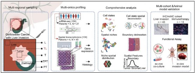 膽囊癌是膽道系統(tǒng)中侵襲性最強的惡性腫瘤之一,因解剖位置緊鄰肝臟,極易發(fā)生直接肝侵犯,進而導致根治性手術范圍擴大、手術難度顯著提升、患者整體預后不良。腫瘤由膽囊原位侵犯至肝臟后,其生物學行為發(fā)生質的改變,臨床治療策略也需隨之調整。盡管肝侵犯在膽囊癌中極為常見,但腫瘤—肝臟交界處微環(huán)境的細胞組成、空間架構及免疫調控機制,長期以來尚未得到系統(tǒng)闡明,成為制約膽囊癌診療突破的關鍵難題。