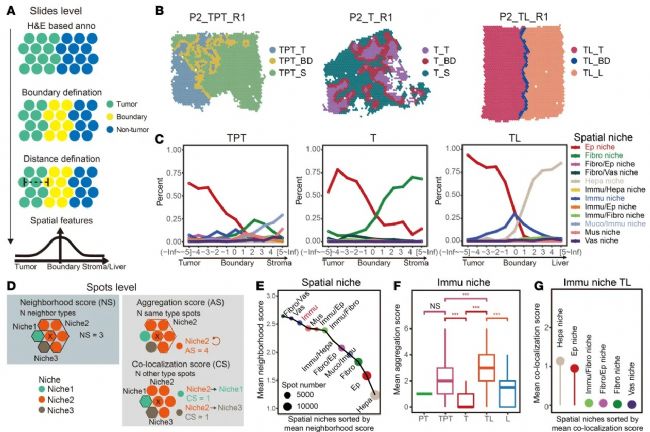 為破解這一臨床科研瓶頸,該研究團隊對8例伴有肝臟侵犯的膽囊癌患者進行多區(qū)域取樣,結合單細胞RNA測序、10xVisium以及10xVisium HD等空間轉錄組技術,全面刻畫從腫瘤核心、腫瘤-肝臟侵犯交界區(qū)直至正常肝組織的細胞構成空間梯度。團隊還自主開發(fā)空間位置分析工具POSST,實現(xiàn)對微環(huán)境中各細胞分布特征的精準定量描繪,清晰揭示腫瘤-肝臟邊界處的細胞動態(tài)變化規(guī)律。