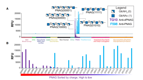 該團隊使用微陣列生物芯片點樣儀將873種不同的糖復(fù)合物(PNAG、糖蛋白、糖肽、糖脂、聚糖等)點印在PolyAn 2D環(huán)氧修飾的功能化玻片上,并使用125 - 200μg/mL的單克隆抗體TG10和F598孵育,隨后使用Cy3標(biāo)記的熒光二抗結(jié)合,結(jié)果采用IS激光共聚焦熒光微陣列生物芯片掃描分析儀進行統(tǒng)計分析,數(shù)據(jù)顯示抗體有良好的選擇性,僅對PNAG有相互作用。在對PNAG多糖序列設(shè)計時,主要針對5個不同的PNAG乙酰化位點,數(shù)字1代表乙;0代表去乙;l(fā)現(xiàn)抗體TG10主要結(jié)合去乙;疨NAG、抗體F598主要結(jié)合乙;疨NAG,如圖1