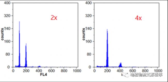 (左圖是二倍體,主峰在橫坐標(biāo)100位置。右圖是四倍體,主峰在200位置)