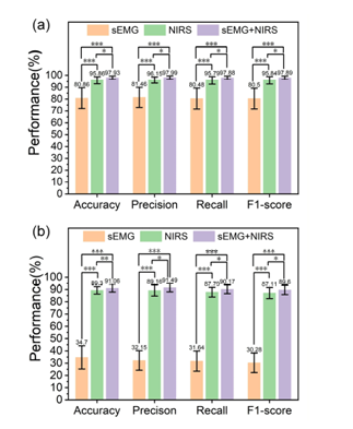 • 模態(tài)互補(bǔ)性:結(jié)果顯示,融合模型的識(shí)別效果優(yōu)于部分單一模態(tài)測(cè)試。研究指出,NIRS在反映深層肌群代謝變化方面具有特點(diǎn),而sEMG在捕捉快速神經(jīng)驅(qū)動(dòng)變化上表現(xiàn)敏感,兩者結(jié)合有助于提升信息的完整性。