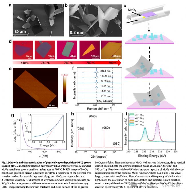 在二維材料電子學(xué)中,如何制備出高介電常數(shù)(κ)、超薄、界面無損傷的介電層,是決定器件性能的關(guān)鍵問題。傳統(tǒng)的 Al₂O₃ 或 HfO₂ 雖有高 κ 特性,但使用原子層沉積(ALD)方法時(shí),容易在二維半導(dǎo)體(如 MoS₂)表面造成缺陷與污染,導(dǎo)致漏電流高、控制力差?蒲袌F(tuán)隊(duì)采用物理氣相沉積(PVD)技術(shù),在高溫下生長出垂直取向(standing)的 MoO₃ 納米片;這種生長方式使 MoO₃ 自由站立(free-standing),表面不與基底接觸;隨后使用無聚合物轉(zhuǎn)移(polymer-free transfer)技術(shù),將其直接疊放到二維半導(dǎo)體上,實(shí)現(xiàn)范德華界面結(jié)合(vdW stacking)。