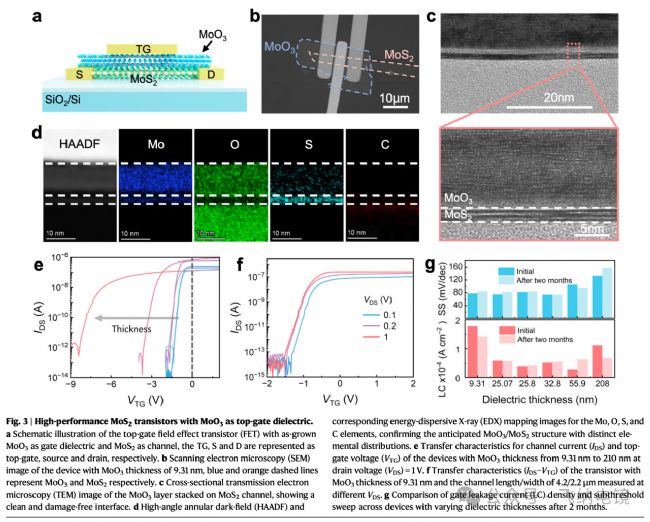 這一組圖(論文 Fig. 3 a–g)全面展示了 MoO₃ 介電層 + MoS₂ 通道的晶體管結(jié)構(gòu)、界面質(zhì)量、電學(xué)性能及長期可靠性。(a)頂柵場效應(yīng)晶體管(FET)的結(jié)構(gòu)示意圖,其中原位生長的 MoO₃ 作為柵介電層,MoS₂ 作為導(dǎo)電通道;圖中 TG、S、D 分別代表頂柵(Top Gate)、源極(Source)和漏極(Drain)。(b) 器件的掃描電子顯微鏡(SEM)圖像,MoO₃ 厚度為9.31 nm;圖中藍(lán)色虛線標(biāo)示 MoO₃ 層位置,橙色虛線標(biāo)示 MoS₂ 通道層位置。(c) MoO₃/MoS₂ 疊層結(jié)構(gòu)的橫截面透射電鏡(TEM)圖像,展示出界面平整、無污染、無損傷的結(jié)合特征。(d) 高角環(huán)形暗場(HAADF)像及能量色散X射線(EDX)元素分布圖,顯示 Mo、O、S、C 元素分布清晰,進(jìn)一步驗(yàn)證了 MoO₃/MoS₂ 結(jié)構(gòu)的正確性與元素分層特征。