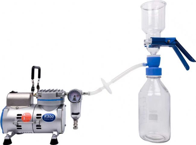 ●真空抽濾裝置,屬于實(shí)驗(yàn)室常用的批量過濾裝置,傳統(tǒng)的真空抽濾裝置通常由玻璃抽濾瓶、砂芯過濾漏斗、微孔濾膜、真空泵組成,適配100mL以上大批量流動(dòng)相過濾。過濾孔徑常用0.45μm,UHPLC及液質(zhì)聯(lián)用實(shí)驗(yàn)選用0.22μm,濾膜的材質(zhì)也分為水系或有機(jī)兩種。過濾的同時(shí),可借助負(fù)壓完成流動(dòng)相脫氣,一舉兩得,適合常規(guī)色譜實(shí)驗(yàn)的批量前處理。近年來新出現(xiàn)的流動(dòng)相試劑專用真空抽濾裝置,比如R300MF,在構(gòu)造上也進(jìn)行了改進(jìn),設(shè)計(jì)出一款過濾連接蓋,用于上面連接砂芯過濾漏斗,下面連接實(shí)驗(yàn)室普通藍(lán)蓋玻璃試劑瓶。這樣濾液通過濾膜后,就可以直接進(jìn)入試劑瓶?jī)?nèi)進(jìn)行保存,或者直接連接進(jìn)樣蓋使用,不再需要將過濾好的流動(dòng)相試劑從抽濾瓶中倒出轉(zhuǎn)移,大幅降低二次污染風(fēng)險(xiǎn)。