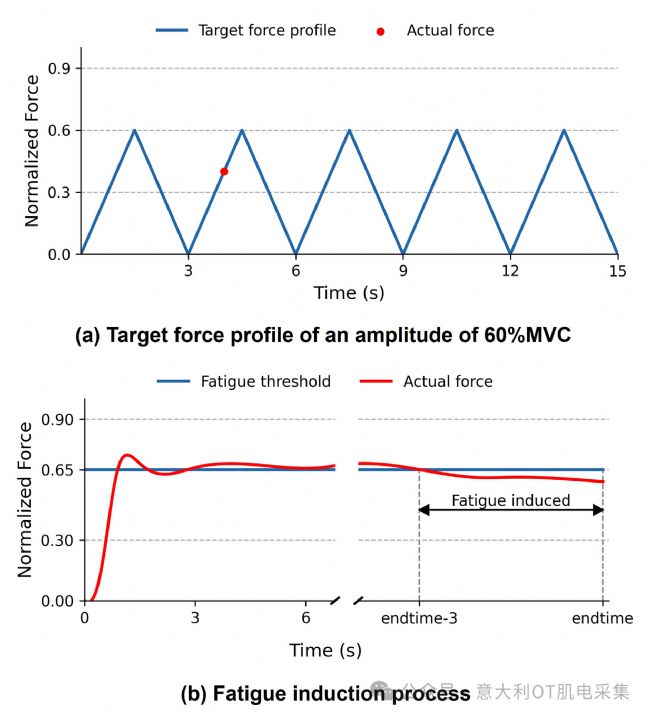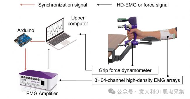 本研究使用高密度肌電信號采集系統(tǒng)(Quattrocento,OT Bioelettronica,意大利)和三個(gè)64通道電極陣列,電極間距為10 mm,放置于前臂負(fù)責(zé)抓握力的關(guān)鍵肌肉區(qū)域(如指淺屈肌、指深屈肌、拇長屈肌等)。肌電信號采樣率為2048 Hz,分辨率為16 bit,參考電極置于手腕處。同步采集抓握力信號(Biometrics G200,200 Hz),并通過Arduino UNO實(shí)現(xiàn)信號同步。實(shí)驗(yàn)分為三個(gè)階段:最大隨意收縮測量、非疲勞狀態(tài)數(shù)據(jù)采集、疲勞誘導(dǎo)與數(shù)據(jù)采集。疲勞誘導(dǎo)通過維持65% MVC直至力下降超過3秒實(shí)現(xiàn)。