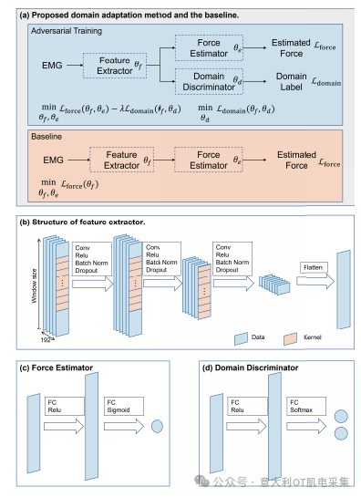數(shù)據(jù)處理方面,肌電信號經(jīng)過20–450 Hz帶通濾波和50 Hz陷波濾波后,以512幀(約250 ms)為窗口輸入模型。所提域自適應(yīng)模型包括特征提取器(三層CNN)、力估計(jì)器與域判別器,采用對抗訓(xùn)練策略對齊源域與目標(biāo)域特征,優(yōu)化目標(biāo)為最小化力估計(jì)損失并最大化域分類損失。
