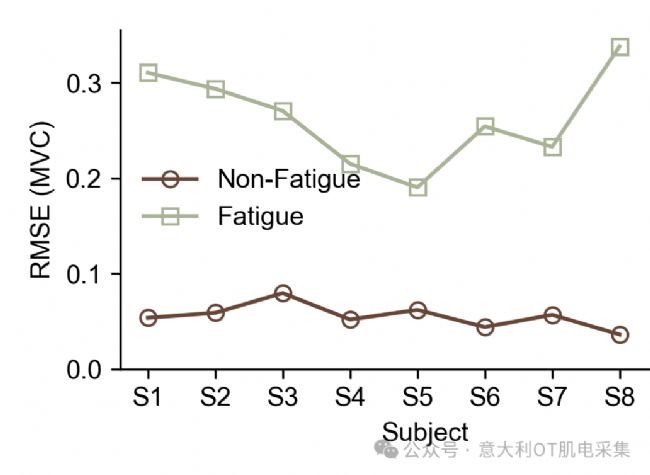 結(jié)果顯示,所提方法在疲勞狀態(tài)下的均方根誤差較基線模型降低了51.9%(0.127 vs 0.264,p<0.05)。域判別器的分類準(zhǔn)確率由98.52%降至51.82%,表明特征提取器成功提取了域不變特征。該方法無需疲勞狀態(tài)下的力標(biāo)簽,具有較高的實(shí)用性和推廣潛力,可用于假肢、外骨骼等連續(xù)控制任務(wù)中。