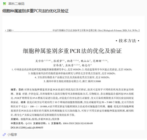 近日,《中國(guó)生物制品學(xué)雜志》2026年第2期上發(fā)表了題為《細(xì)胞種屬鑒別多重PCR法的優(yōu)化及驗(yàn)證》的研究論文。通過(guò)對(duì)原有細(xì)胞種屬鑒別多重PCR法進(jìn)行系統(tǒng)性再優(yōu)化與大規(guī)模驗(yàn)證,成功建立了一種快速、靈敏、高穩(wěn)健性的標(biāo)準(zhǔn)化檢測(cè)方法,為2025年版《中國(guó)藥典》新增通則3430提供了堅(jiān)實(shí)的技術(shù)支撐。