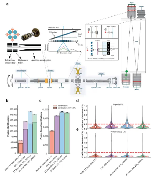 研究團(tuán)隊基于ZenoTOF 8600,將ZT Scan DIA與傳統(tǒng)可變窗口DIA(Zeno SWATH DIA)在進(jìn)行對比,質(zhì)譜上機(jī)均為250 ng HEK 293T 細(xì)胞裂解液,結(jié)果統(tǒng)計見Figure 1b-e,可以看出ZT Scan DIA能鑒定到更多肽段和蛋白組,對比同條件下的傳統(tǒng)可變窗口 DIA,鑒定深度大幅提升;定量方面,蛋白組水平中位變異系數(shù)(CV)低至 2.8%,優(yōu)于傳統(tǒng)DIA的3.4%,且CV<20% 的蛋白組占比進(jìn)一步提升。這一結(jié)果證實,連續(xù)掃描的 ZT Scan DIA 能在相同上樣量的情況下,同時實現(xiàn)更深的覆蓋度和更精準(zhǔn)的定量,解決了傳統(tǒng)DIA鑒定與定量的平衡難題。