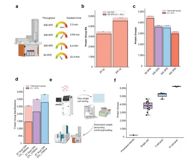 蛋白質(zhì)組學(xué)研究對通量和檢測深度的需求因場景而異,選用ZenoTOF 8600在全通量范圍內(nèi)開展相關(guān)分析(Fig.2a-f)。對于超高通量分析需求,可實現(xiàn)500樣本/天(500 SPD)的分析,200 ng K562細(xì)胞裂解液可鑒定~4800個蛋白組,20 ng微量樣本仍能鑒定~3200個蛋白組,該性能接近前一代ZenoTOF 7600+在60 SPD下的檢測深度;酵母樣本在500 SPD下也能鑒定~3200個蛋白,證實該平臺的性能與物種特異性無關(guān)。單細(xì)胞蛋白質(zhì)組學(xué)的分析需求對儀器靈敏度的較高,ZenoTOF 8600在單個HeLa細(xì)胞中可鑒定3000-4700個蛋白組(中位數(shù)約3900),空白對照僅鑒定~300個蛋白,排除了污染/殘留的干擾;3個細(xì)胞和10個細(xì)胞混合樣本則分別達(dá)到~5300和~6300個蛋白的鑒定,接近復(fù)雜樣本的檢測深度。