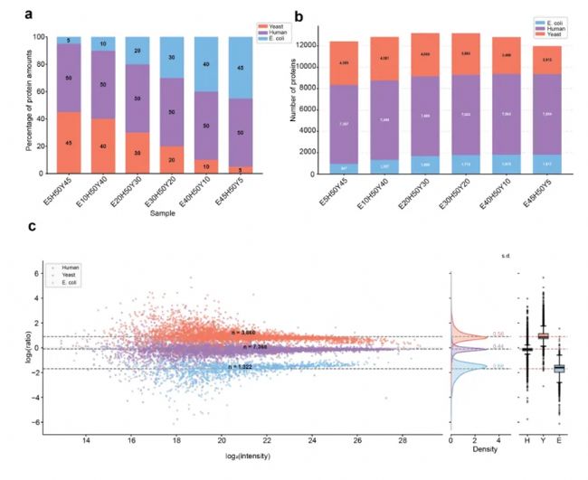 定量準(zhǔn)確性是蛋白質(zhì)組學(xué)臨床轉(zhuǎn)化的核心要求,團(tuán)隊采用已知比例的人/酵母/大腸桿菌混合物種標(biāo)準(zhǔn)品進(jìn)行儀器定量準(zhǔn)確性的驗證(500 ng質(zhì)譜上樣量),人源蛋白比例固定為50%,酵母和大腸桿菌蛋白占比從5%到45%反向變化,鑒定和定量結(jié)果見Figure 3。從Fig.3a-b可以看出,人源蛋白的鑒定數(shù)保持穩(wěn)定,表明檢測不受其他基質(zhì)組成的干擾;Fig.3c的定量比值與理論值高度吻合,人源蛋白log2比值標(biāo)準(zhǔn)差僅0.44,大腸桿菌(最大倍性變化)也僅0.66,無明顯系統(tǒng)偏差;結(jié)合ZT Scan DIA的蛋白水平CV中位數(shù)<4%,其定量精度已接近三重四極桿的靶向檢測水平。