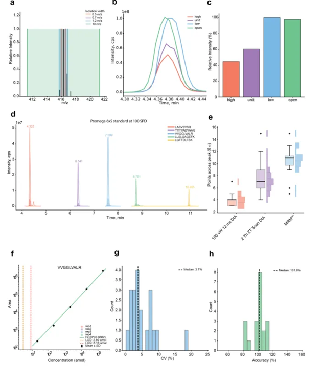 ZenoTOF 8600 具有Zeno MRMHR(高分辨多反應(yīng)監(jiān)測)靶向模式,提供4種分辨率可選,兼顧選擇性和靈敏度(檢測結(jié)果見Fig.4a-h)。ZT Scan DIA和MRMHR模式下,色譜峰半高寬(FWHM)內(nèi)可獲得≥7個數(shù)據(jù)點(diǎn),采樣密度充足,保證峰面積積分的準(zhǔn)確性。靈敏度低至埃摩爾,在250 ng HEK背景基質(zhì)中,VVGGLVALR肽段的柱上檢測限低至2.7 attomole,線性范圍跨4個數(shù)量級(R²=0.988)。定量精準(zhǔn),可定量范圍內(nèi)CV中位數(shù)僅3.2%,實測濃度與理論值偏差<20%,中位回收率101.6%,且保留完整MS/MS譜圖,可實現(xiàn)分析物確證,降低假陽性。支持在同一儀器上無縫切換發(fā)現(xiàn)型DIA和靶向型MRMHR,無需在不同平臺重新開發(fā)方法,加速從候選物發(fā)現(xiàn)到驗證的轉(zhuǎn)化流程。